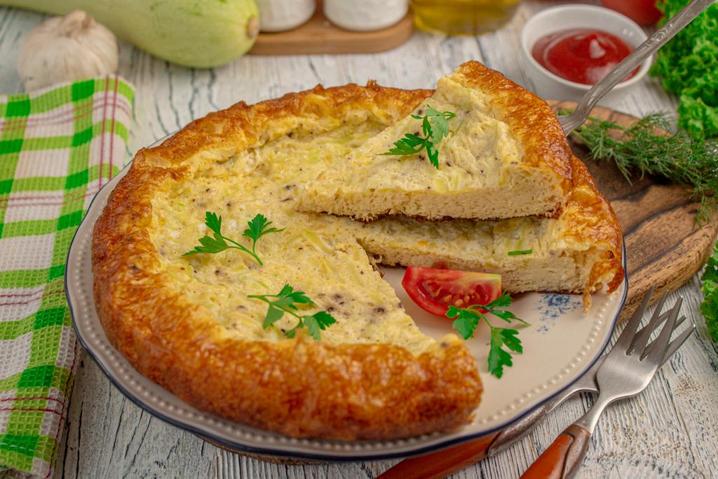 Нежный, сочный омлет с кабачком, приготовленный в мультиварке, нарежьте на кусочки и подавайте к столу.