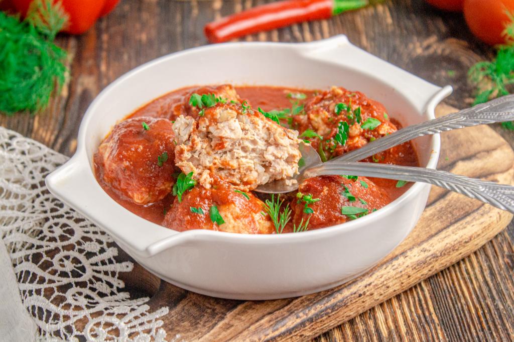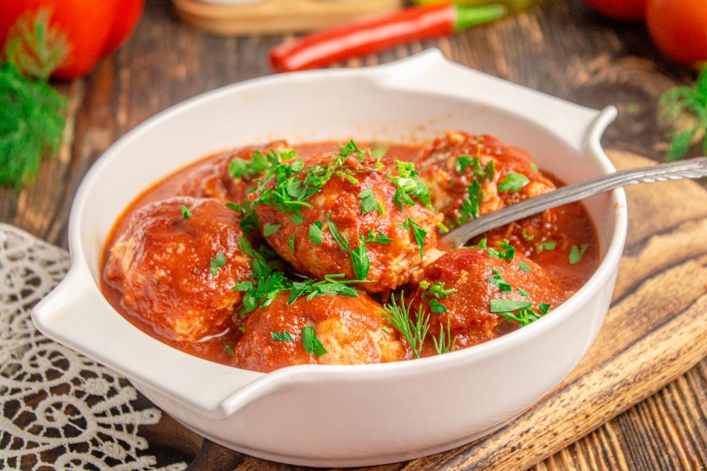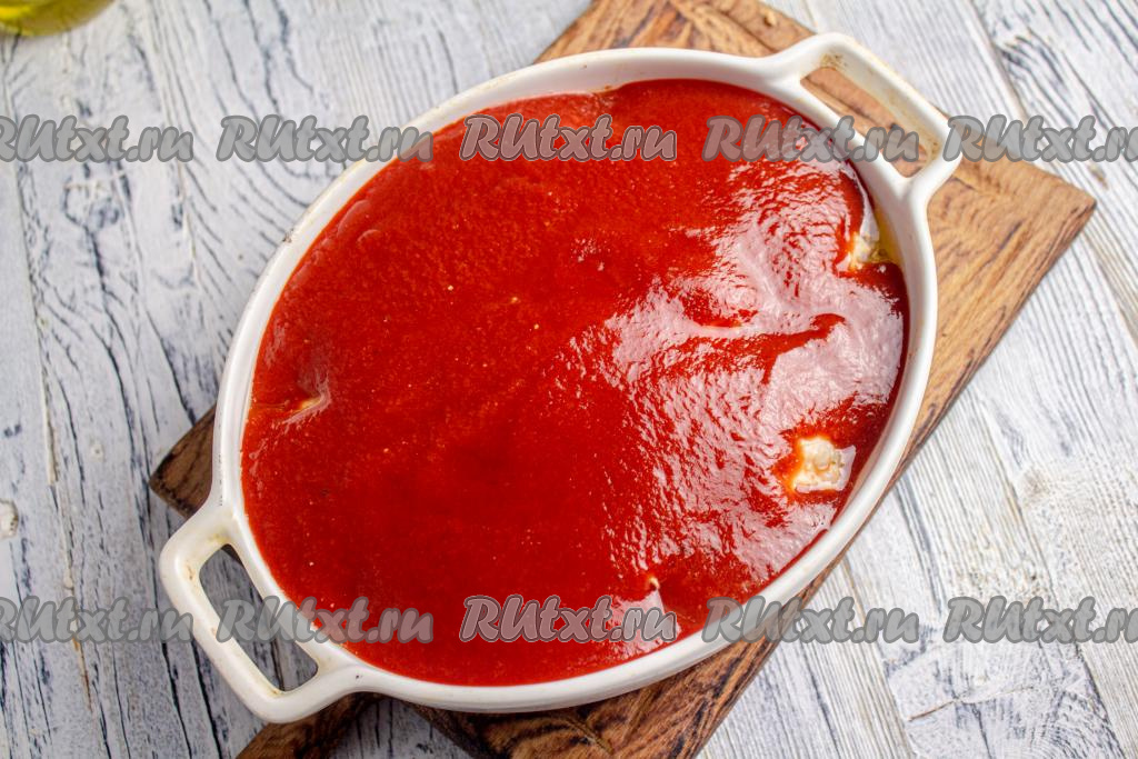 По истечении 10 минут достаньте тефтели из духовки, залейте томатным соусом и поставьте обратно в духовку запекаться минут 30 при температуре 180 градусов.
