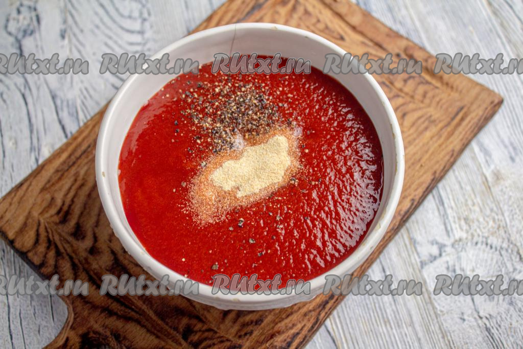 Пока тефтели запекаются, приготовьте соус, для этого томатный соус (или томатную пасту, разведённую водой) посолите, поперчите, добавьте сахар и, по желанию, сушёный чеснок.