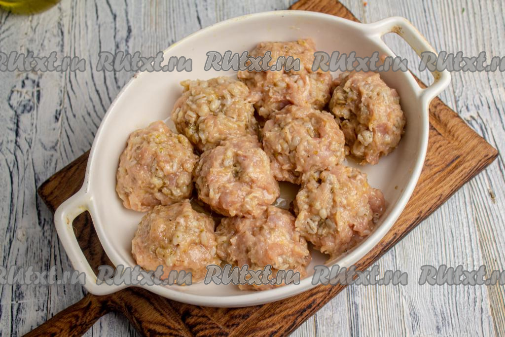 Из фарша сформируйте тефтели (я сформировала 9 штук) и выложите в форму для запекания (у меня форма размером 20 сантиметров на 25 сантиметров), заранее смазанную маслом. Поставьте в разогретую до 200 градусов духовку минут на 10.
