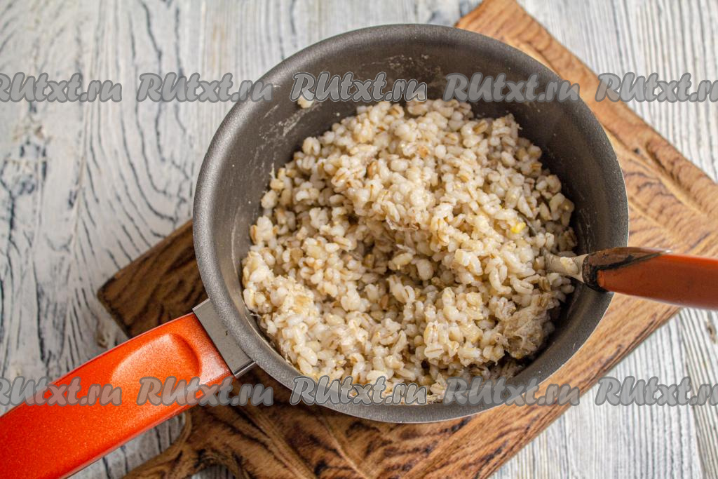 По истечении времени крупа значительно набухнет. Промойте её хорошо, переложите в кастрюльку (или сотейник), залейте чистой водой так, чтобы соотношение крупы и воды было 1:2 (то есть если вы замачивали 1 стакан крупы, то перед варкой залейте её 2 стаканами воды комнатной температуры). Поставьте на огонь, доведите до кипения, а затем варите на небольшом огне минут 30 (до полуготовности перловой каши). Дайте каше полностью остыть.