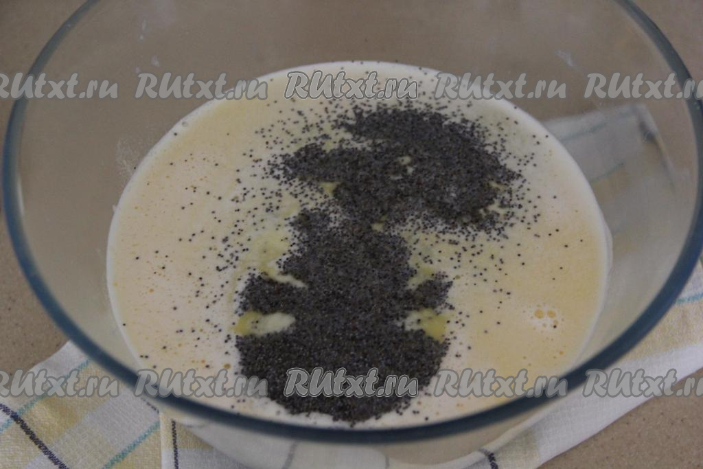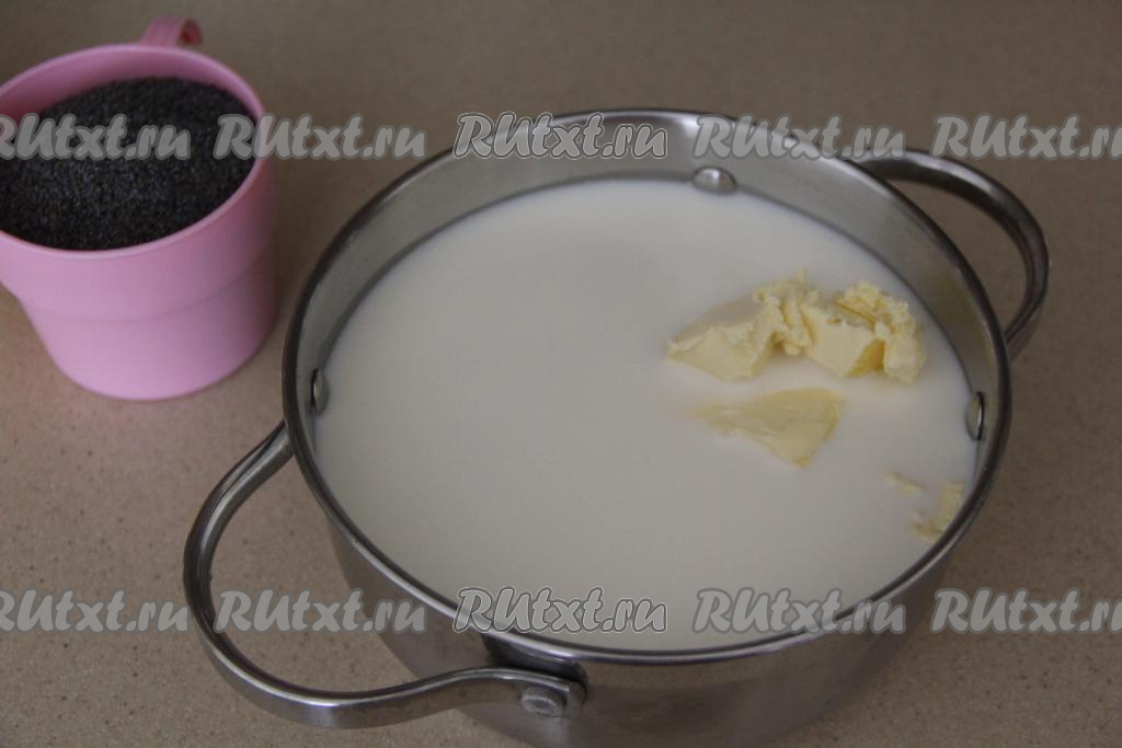 Перелить горячую молочно-масляную смесь (её температура должна быть, примерно, 70 градусов) в миску, добавить мак, перемешать. Затем всыпать манку и ещё раз перемешать. Оставить массу на 20 минут.