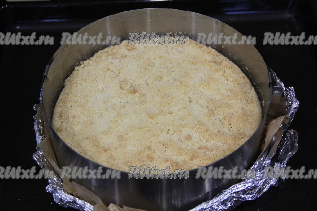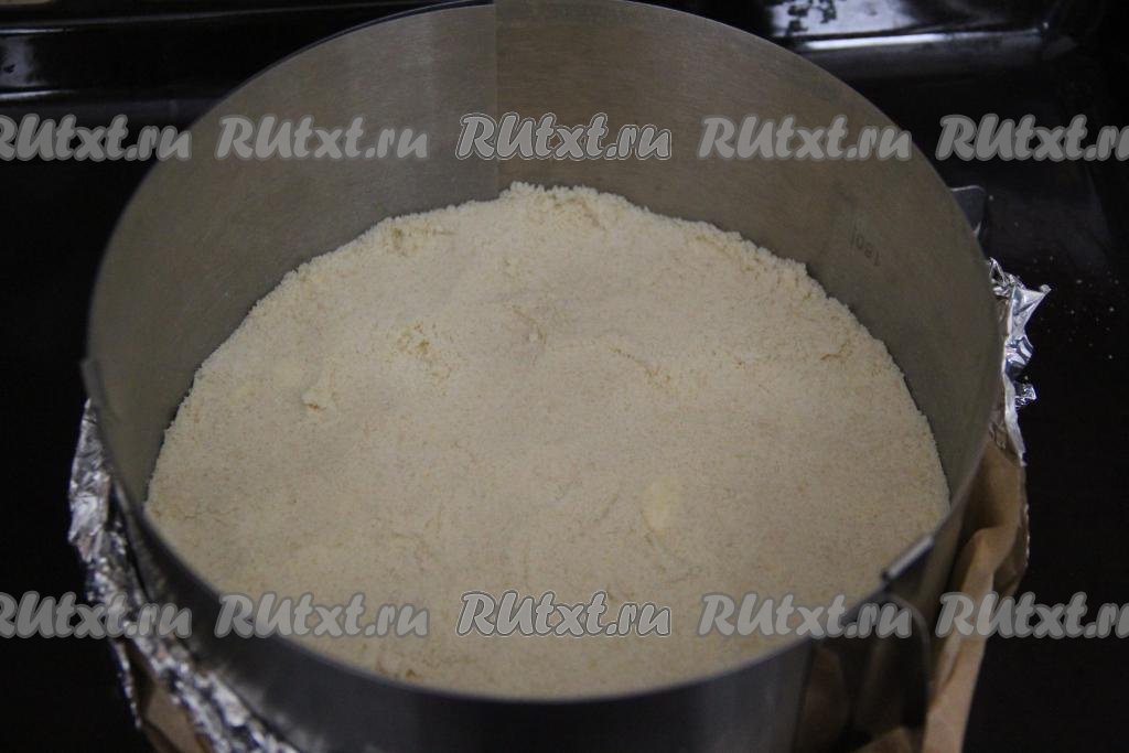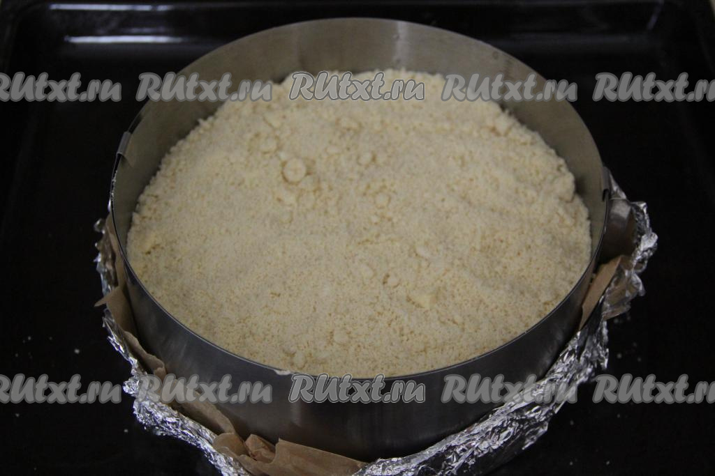 Перетереть массу руками в мелкую крошку. Половину крошки выложить в разъёмную форму для выпечки диаметром 22 сантиметра. В качестве формы я взяла разъёмное кольцо диаметром 22 сантиметра, а дно сформировала из фольги, сложенной в несколько слоёв, и пергамента, а затем выложила половину крошки. Утрамбовать крошку в форме руками. Поставить форму и оставшуюся крошку в холодильник на время, пока подготавливаем начинку.