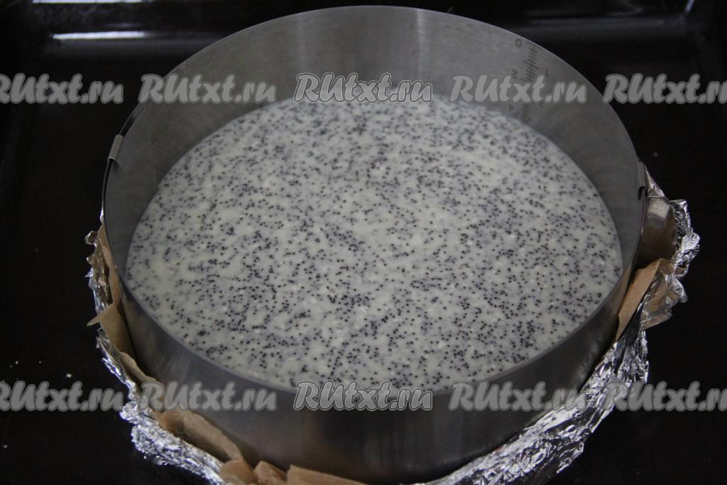 Разъёмную форму достать из холодильника, выложить в неё творожно-маковую массу поверх песочной основы.