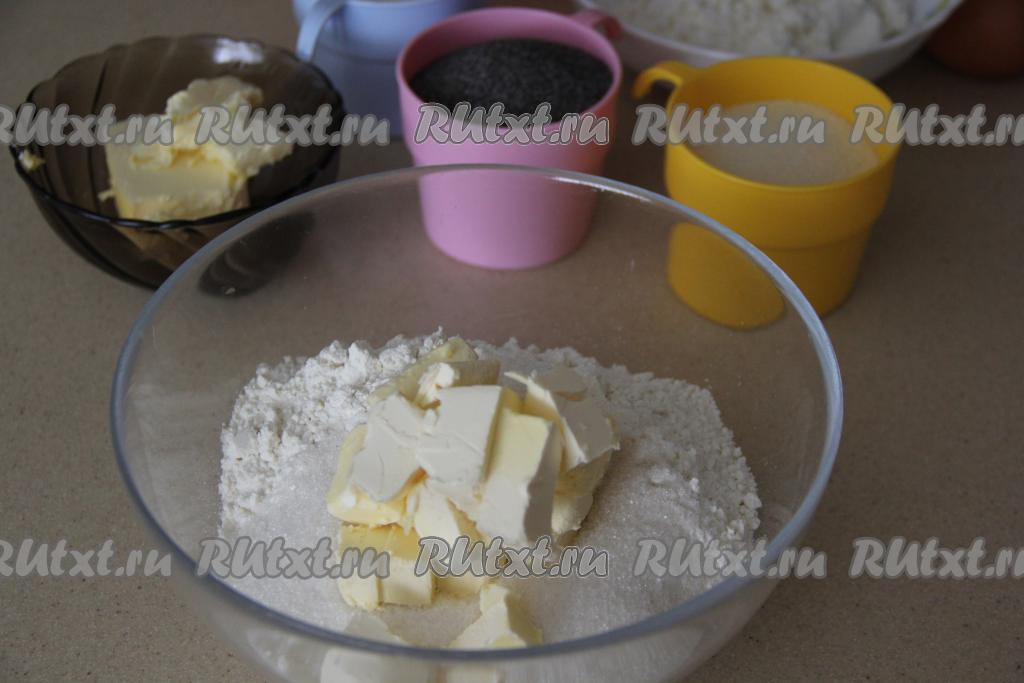 Вначале замесим песочное тесто-крошку, которая и станет основой немецкого макового творожника. Для этого в глубокой миске нужно соединить просеянную муку, сахар и холодное сливочное масло, нарезанное на кубики.