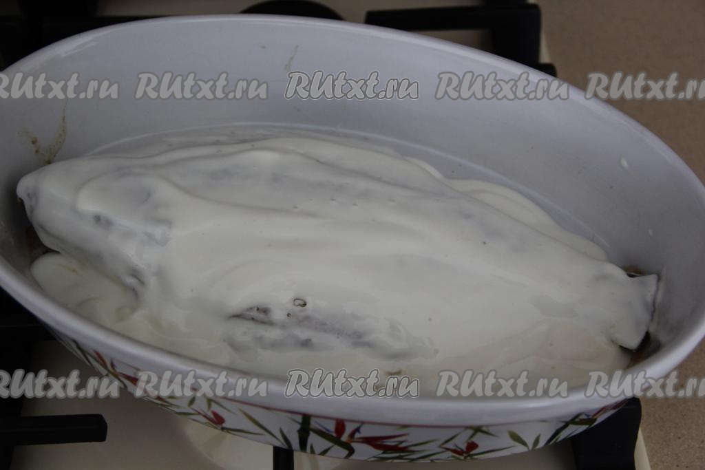 Затем достать форму с лещом, выложить сметану по всей поверхности рыбы. Поставить форму с рыбой обратно в духовку и запекать ещё 20 минут.