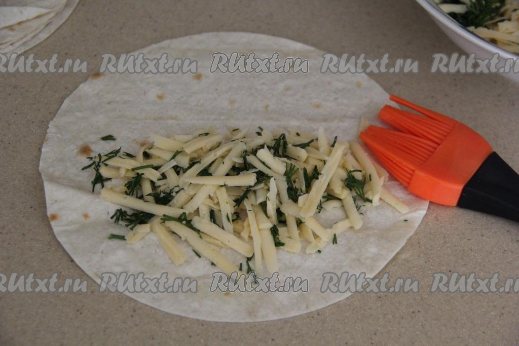 Отделить белок от желтка. Края круга из лаваша, по всему периметру, смазать белком с помощью кулинарной кисти.