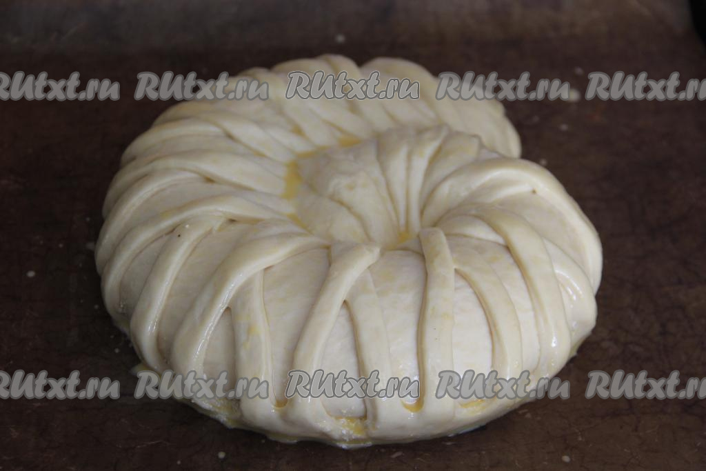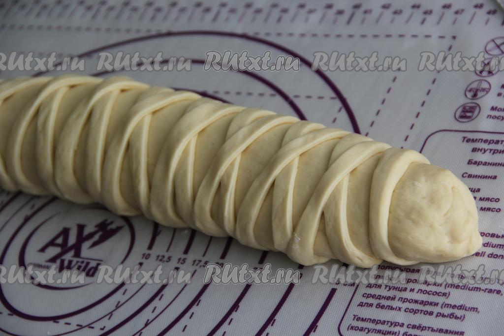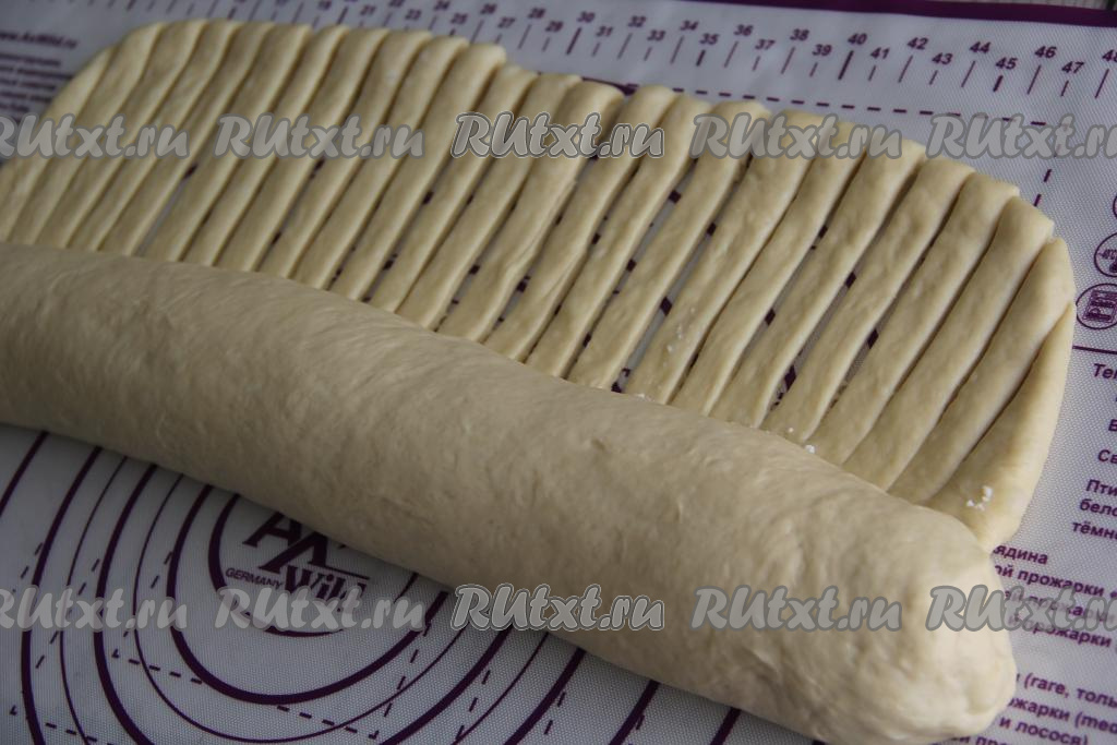 Свернуть тесто с начинкой в рулет, начиная с края, противоположенного краю с полосками. Тесто сворачиваем до начала полосок. Защепить края теста руками с двух боков рулета.