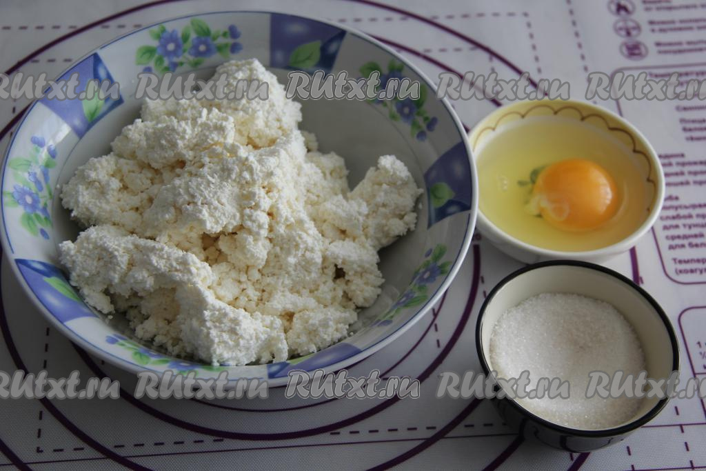 Пока наше дрожжевое тесто подходит, можно приготовить начинку, для этого нужно соединить в глубокой тарелке творог, сахар и яйцо.