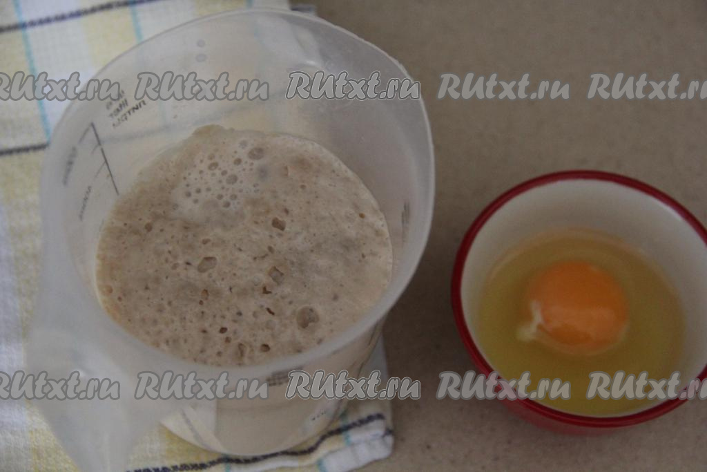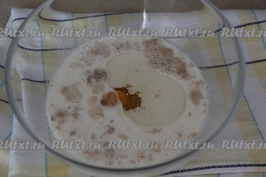 По прошествии времени поверхность молочно-дрожжевой смеси должна покрыться пенной шапочкой (это означает, что дрожжи активировались). Перелить молочно-дрожжевую смесь в миску, удобную для замешивания теста, добавить сырое яйцо и растительное масло, перемешать венчиком.