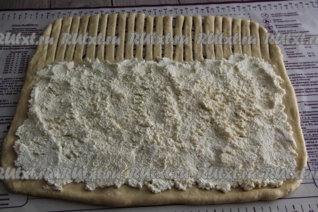 Отступив от одного длинного края 10 сантиметров, выложить творожную начинку на тесто, распределяя её тонким, ровным слоем. С остальных трёх краёв теста, выкладывая начинку, следует отступать по 1 сантиметру от края. 10 сантиметров теста, оставшиеся без начинки, нарезать на полоски шириной 1-1,5 сантиметра, как на фото.