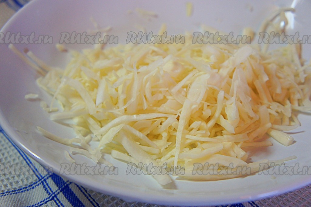 Редьку вымыть, очистить, натереть на корейской тёрке, добавить к капусте.