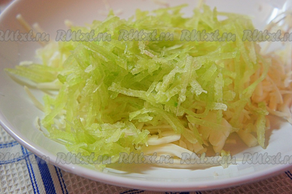 Вкусный, сочный, очень полезный салат с зелёной редькой, капустой и морковью можно подавать к столу.