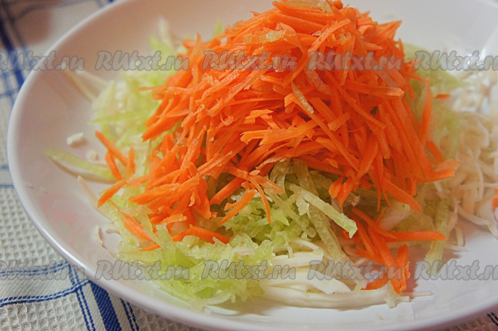 Морковь очистить, натереть на корейской тёрке, добавить в салат из зелёной редьки и капусты.