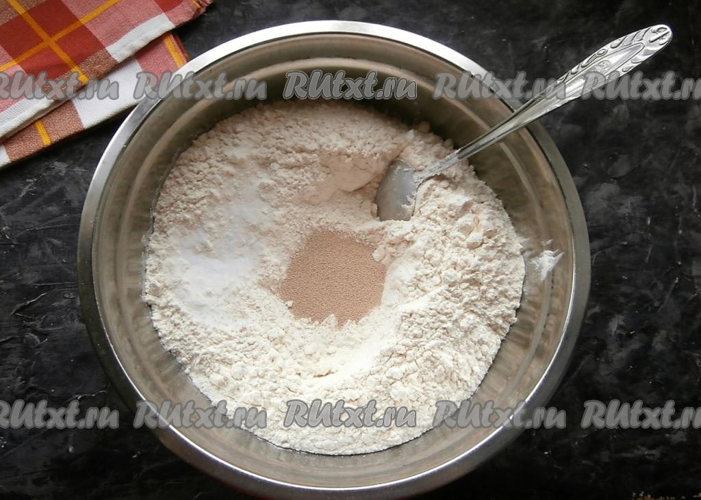 Просеянную муку насыпать в миску, сюда же всыпать соль, сахар и сухие дрожжи.