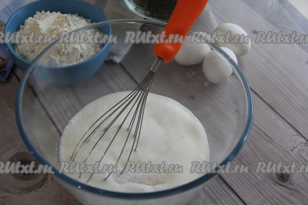 Прежде всего нужно замесить тесто, для этого кефир нужно влить в объёмную миску, добавить соду, хорошо перемешать и оставить на 5-7 минут (за это время произойдёт реакция, в ходе которой сода погасится в кефире). Затем в смесь кефира и соды всыпать соль и сахар, перемешать венчиком.