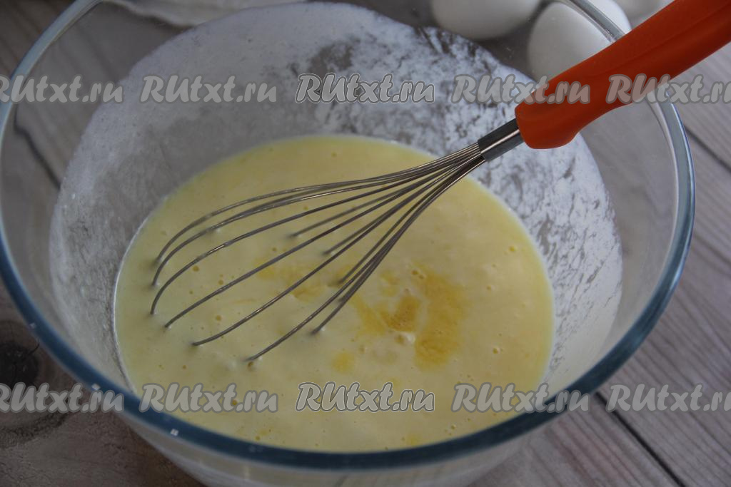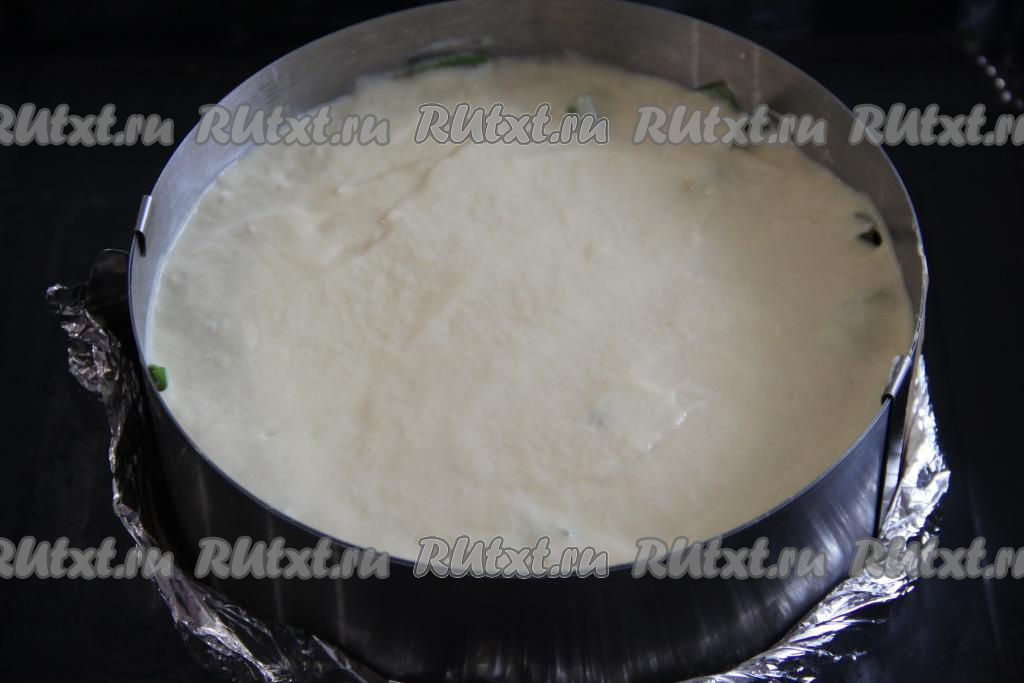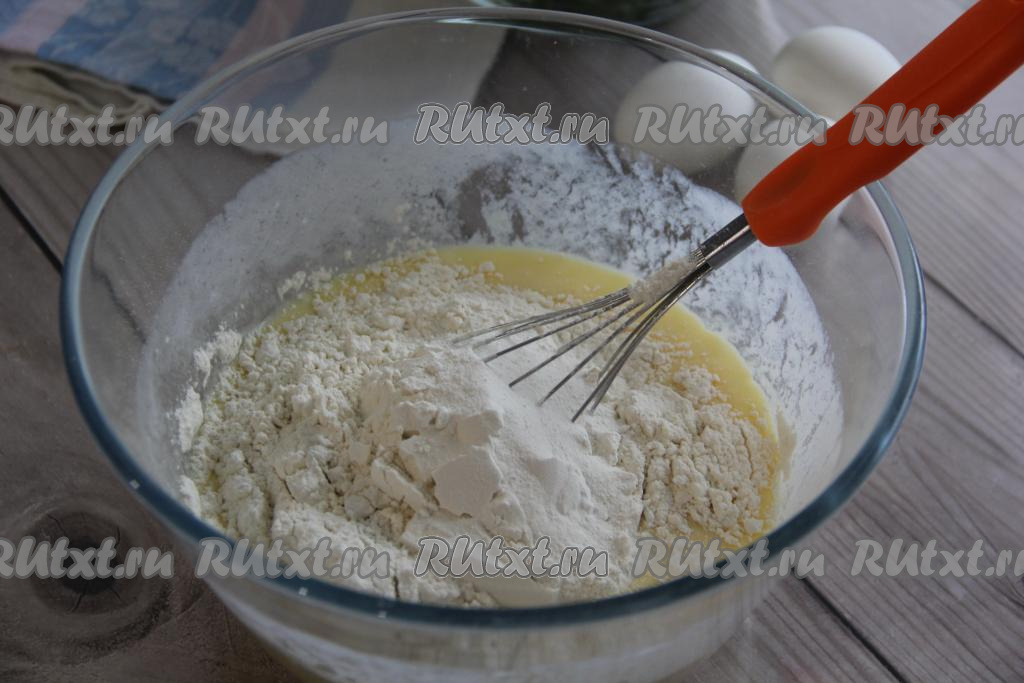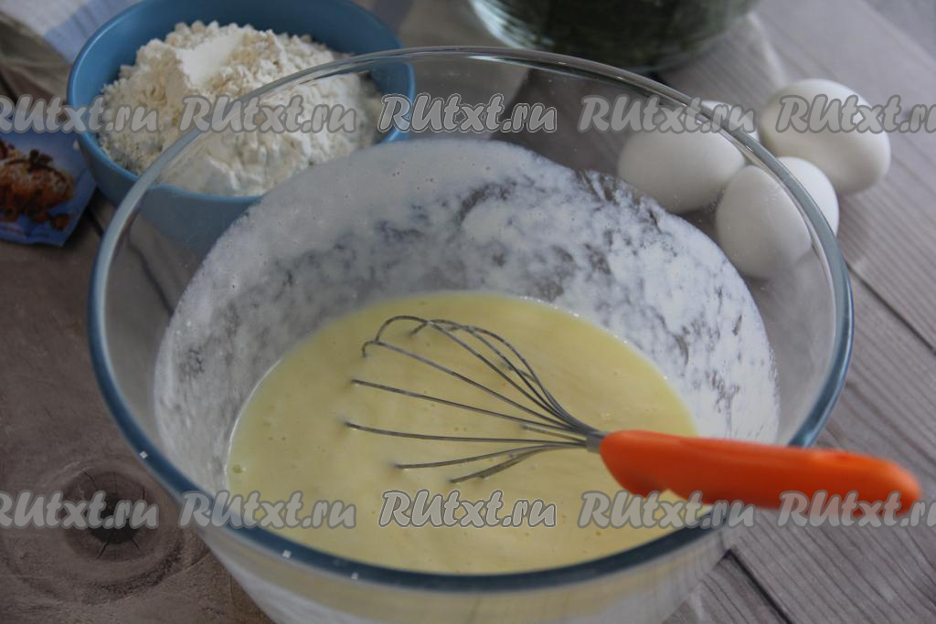 Всыпать разрыхлитель, частями добавить муку, перемешивая тесто венчиком до однородного и гладкого состояния. Тесто для этого заливного пирога должно получиться очень воздушным, нежным, в меру густым, по консистенции оно будет похоже на тесто для оладий.