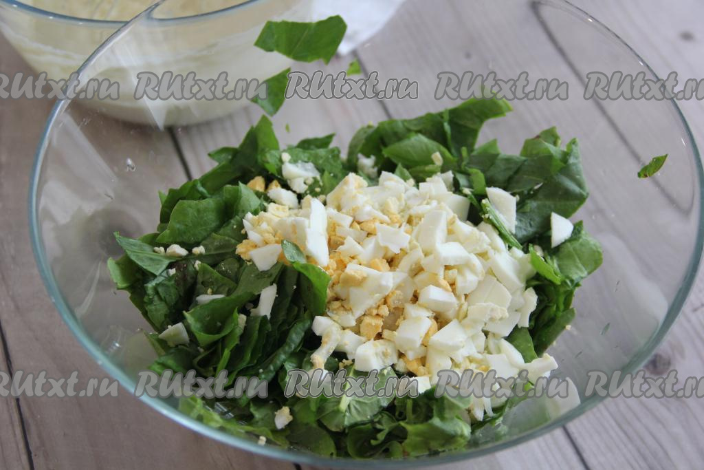 Сваренные вкрутую яйца очистить от скорлупы, мелко нарезать, переложить к щавелю, перемешать, можно слегка посолить.
