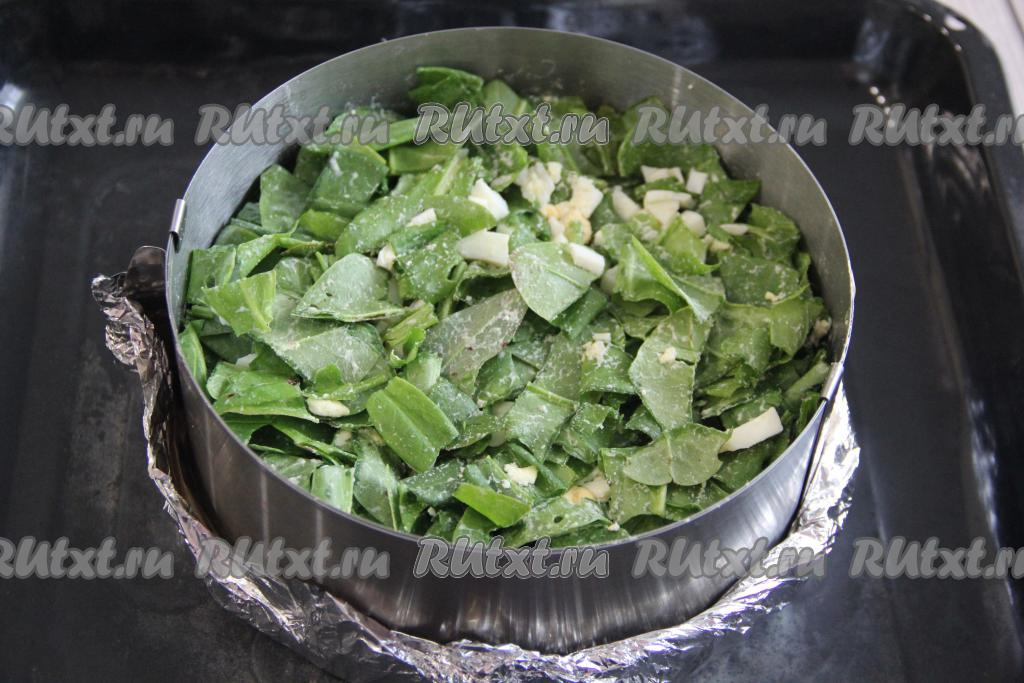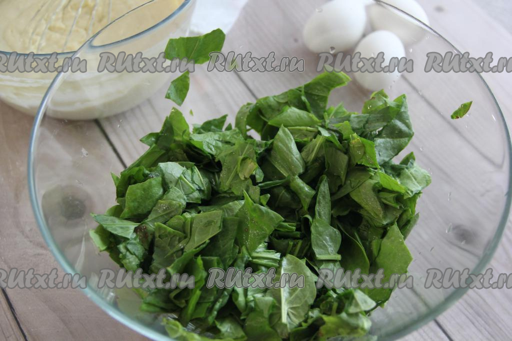Поверх теста равномерно выложить смесь щавеля и варёных яиц, слегка утрамбовать.