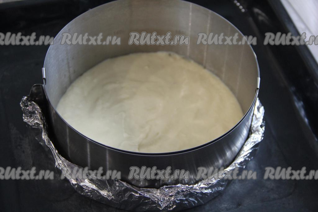 Форму для выпечки смазать растительным маслом и выложить половину теста. У меня кольцо для выпечки диаметром 22 сантиметра, я предварительно укрепила его дно фольгой.