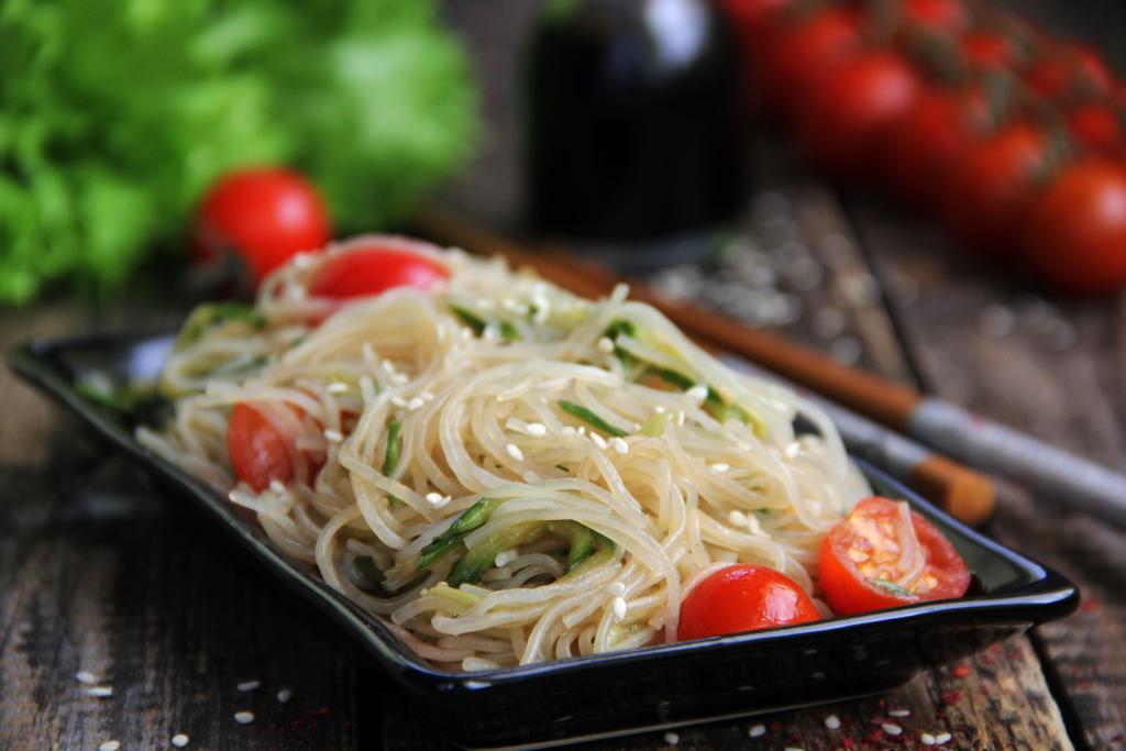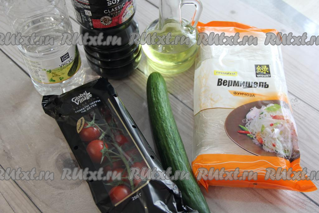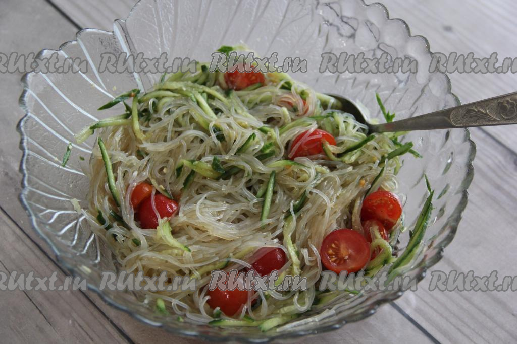 Сегодня фунчозу можно купить практически в любом супермаркете. На основе этой стеклянной лапши предлагаю приготовить простой и вкусный салат из фунчозы с огурцами и помидорами. Помидорчики можно использовать черри или обычные. Остроту этого вкусного салата можете регулировать самостоятельно при помощи ваших любимых специй. Это азиатское блюдо готовится и просто, и быстро, а получается отличным, попробуйте!