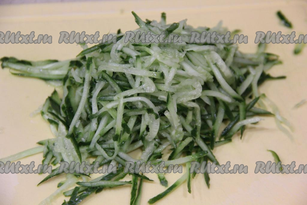 Пока заваривается фунчоза, натереть огурец на тёрке для корейской моркови (можно нарезать длинными брусочками, если нет тёрки).