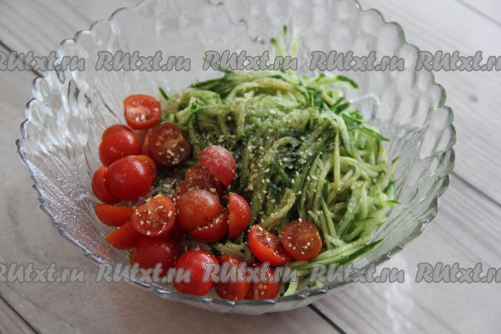 Добавить в салатник к фунчозе помидоры и огурец.