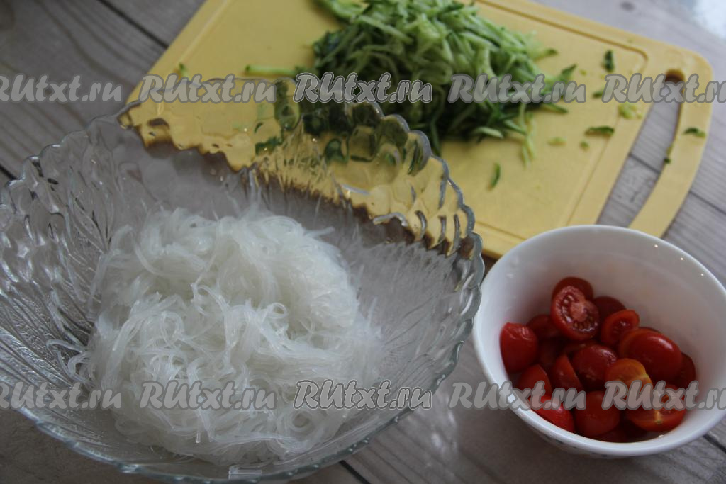 Нарезать фунчозу с помощью ножниц и переложить в салатник. Помидоры черри разрезать пополам. Если используете крупные помидоры, то нарезать их на небольшие дольки.