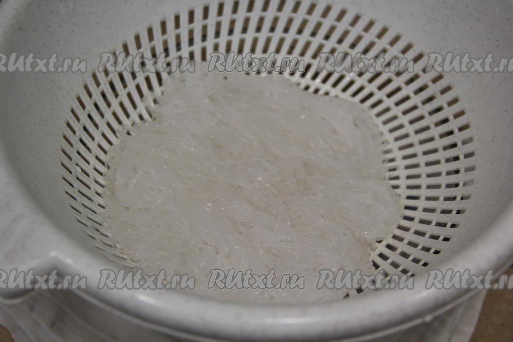 Фунчозу откинуть на дуршлаг, промыть холодной водой и дать стечь воде.
