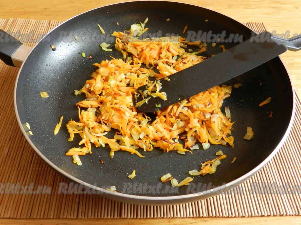 Лук нарезать, морковь натереть на терке, обжарить на растительном масле до золотистого цвета. Посолить и поперчить, добавить приправу.