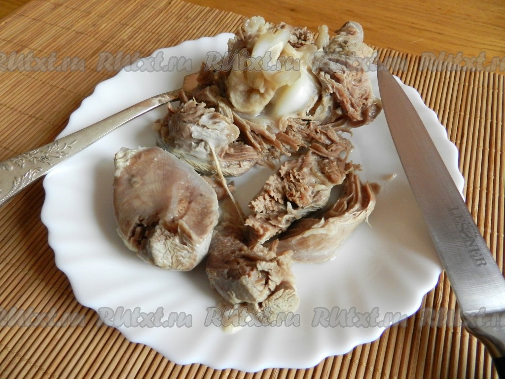 Когда мясо в бульоне сварится, достать его, отделить от кости и вернуть в бульон.