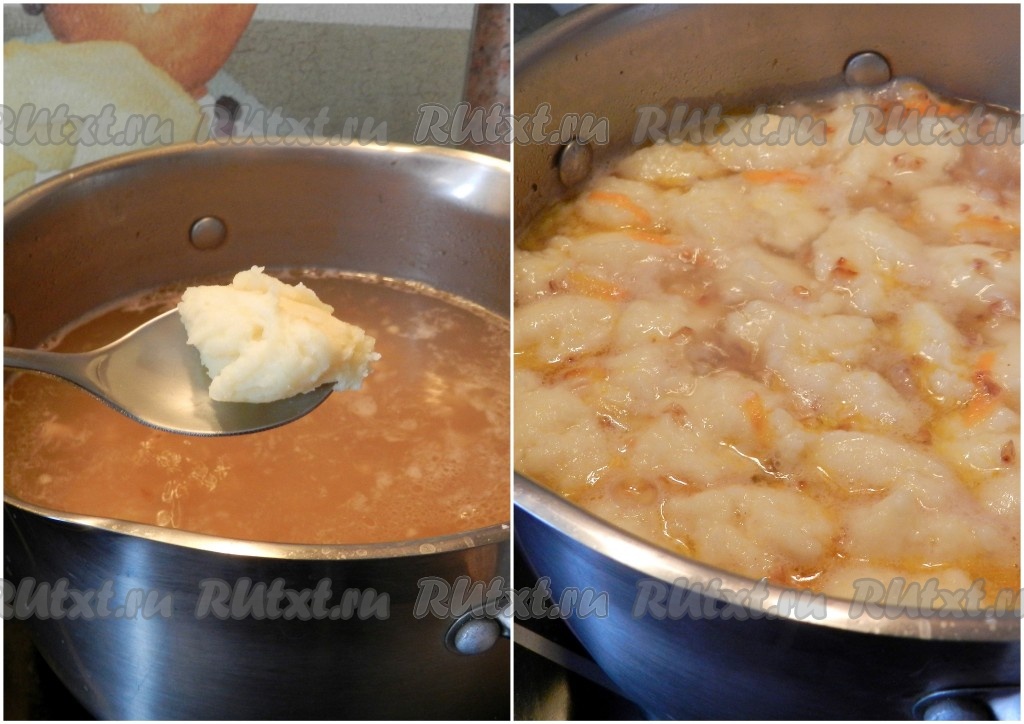 Картофельную массу набирать чайной ложкой (примерно половину) и опускать в кипящий суп. Ложка должна быть смочена, чтобы тесто легко сходило с нее. Добавить в суп обжаренный лук и морковь. Клецки варятся быстро, после того, как они всплывут, поварить еще 1-2 минуты и выключить.