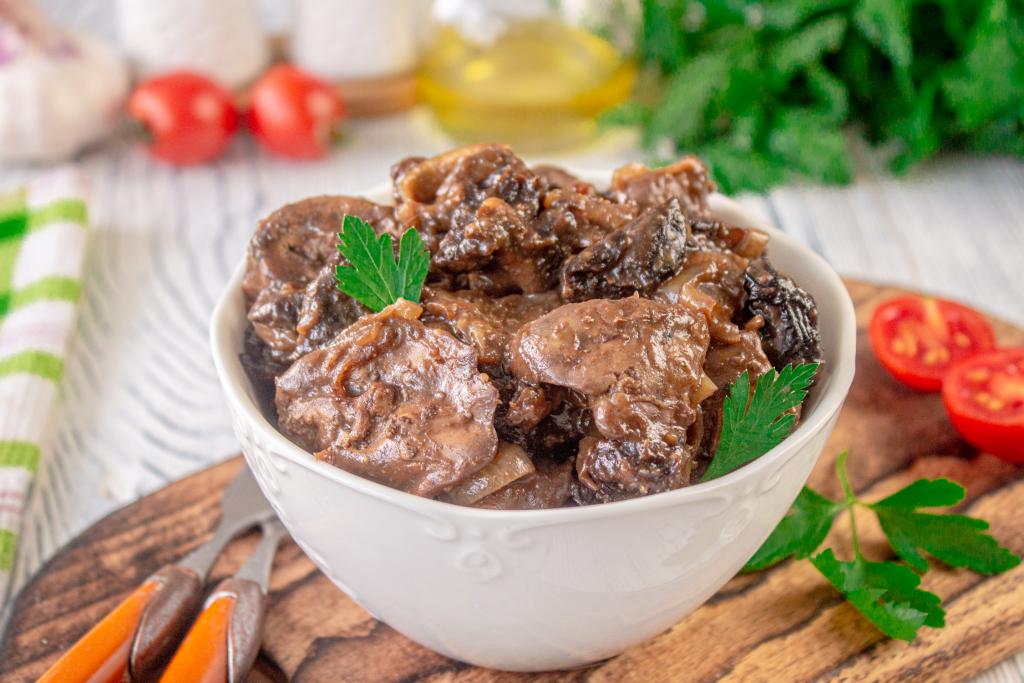 Очень вкусную, ароматную куриную печень, тушёную с черносливом и луком, подавайте к столу в горячем виде, дополнив любимым гарниром.