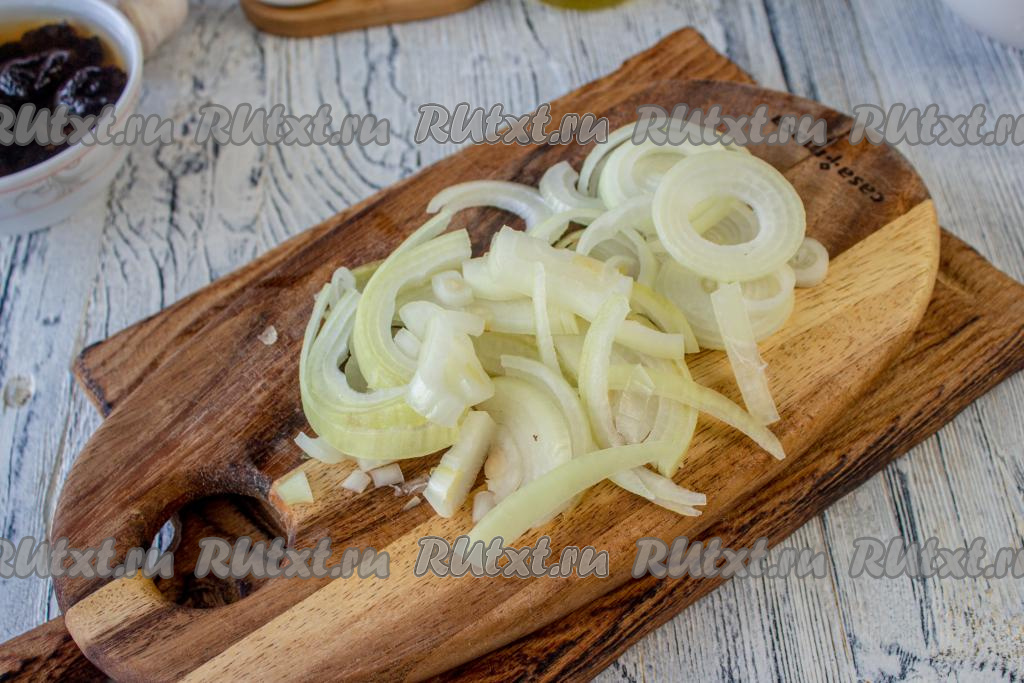 Чернослив замочите в горячей воде на 5 минут. Затем слейте воду, чернослив обсушите и нарежьте на полоски.