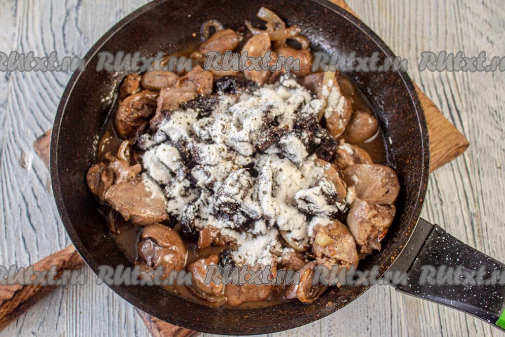В сковороду влейте 50 мл воды, добавьте чернослив и муку, посолите, поперчите по вкусу, уменьшите огонь. Тушите куриную печень с черносливом и луком ещё 5-7 минут, накрыв крышкой (готовность печёнки проверить достаточно просто, надрежьте кусочек ножом, если из разреза выделяется прозрачный сок - значит печёночка полностью готова, если же в разрезе сок с кровяными вкраплениями - значит протушите ещё 1-2 минуты).