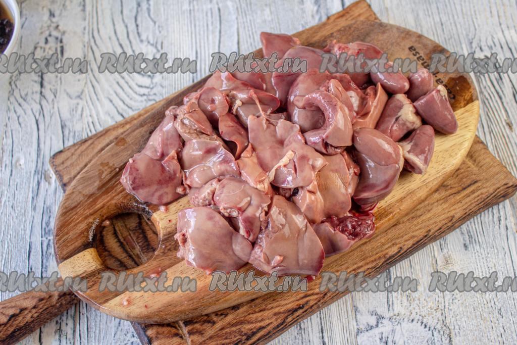 Печёнку очистите от плёнок и капилляров, хорошо её промойте, обсушите и нарежьте на средние кусочки.
