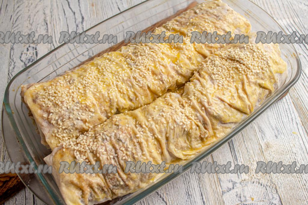 Подготовленные рулеты из лаваша с капустой переложите в форму для запекания, смажьте остатками яйца и, по желанию, присыпьте кунжутом. Запекайте в разогретой духовке 15-20 минут при температуре 190-200 градусов.