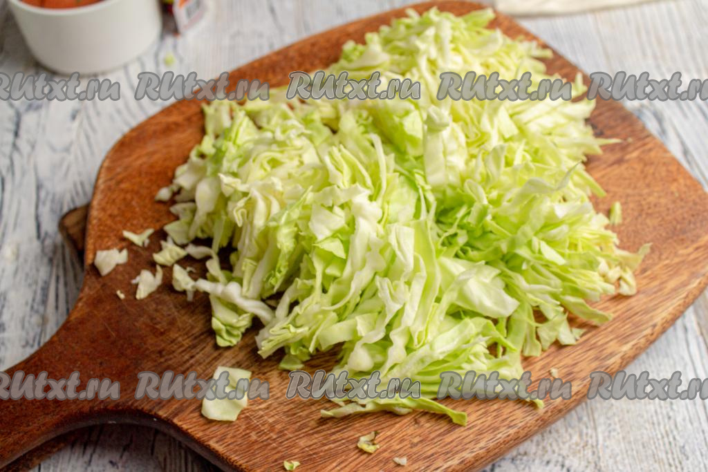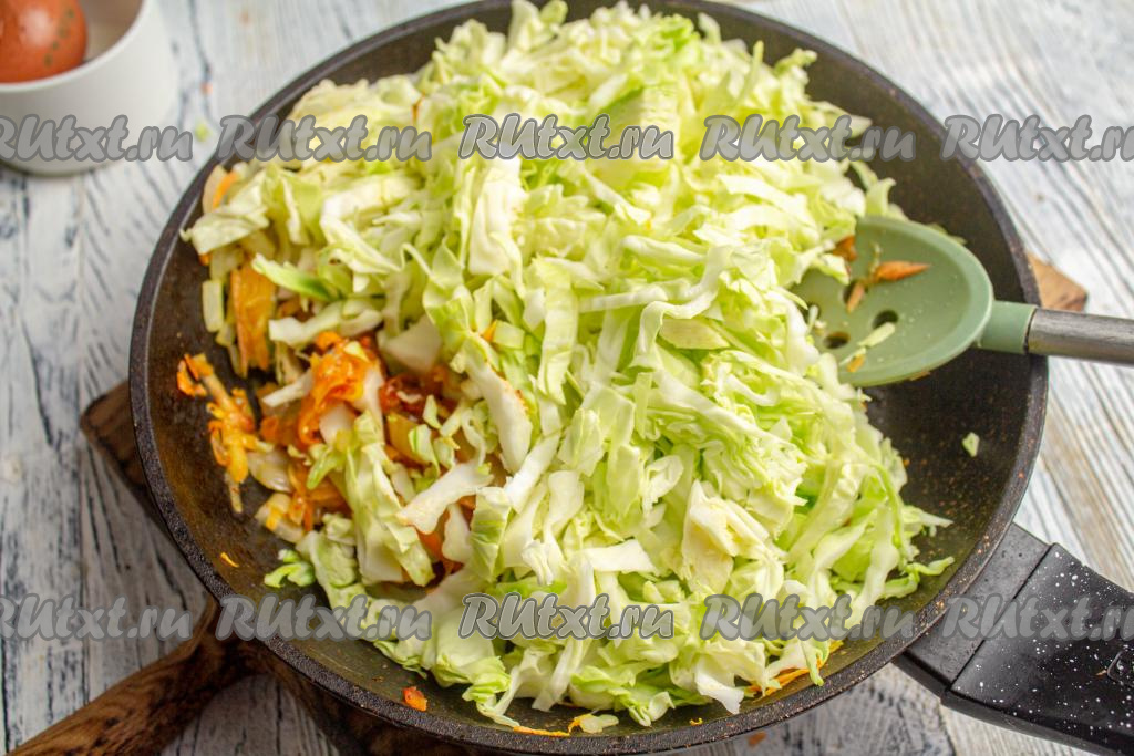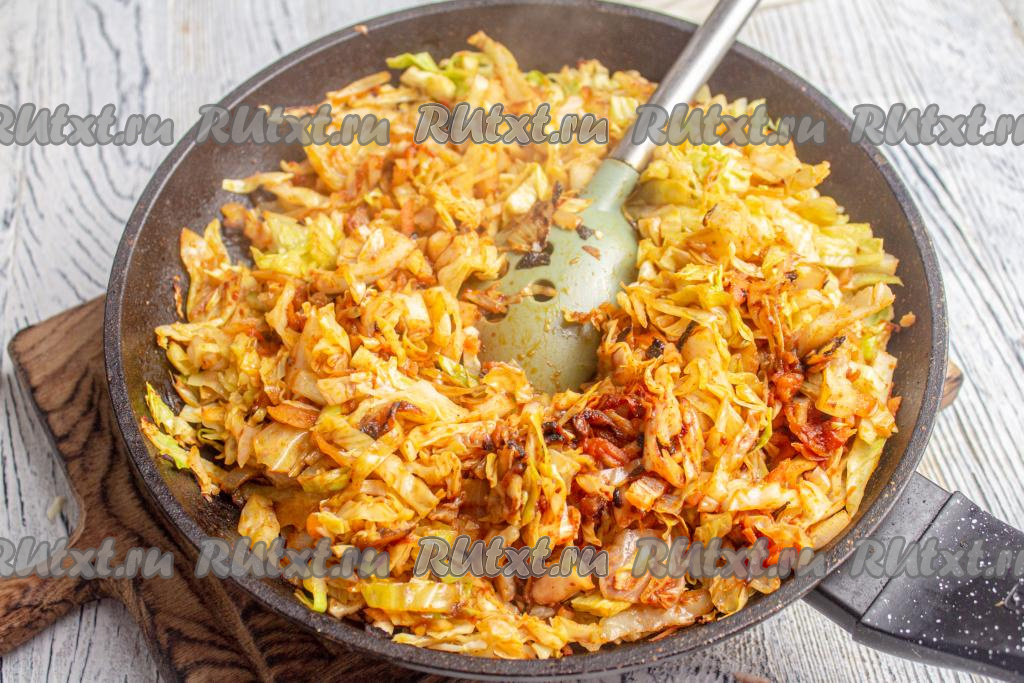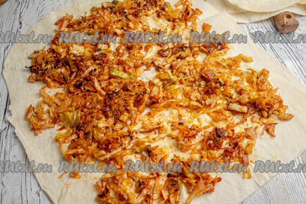 Добавьте капусту в сковороду к овощам, перемешайте и готовьте на среднем огне до мягкости капусты, перемешивая время от времени. Если вы жарите молодую капусту, то на приготовление потребуется минут 15-20. На приготовление капусты зимних сортов потребуется минут 20-25 (но многое зависит от сорта капусты). Если капуста не очень сочная, в процессе обжаривания в сковороду можно добавить 2-3 столовые ложки воды (много воды не добавляйте, так как лишняя жидкость для приготовления рулета из лаваша не нужна). Посолите и поперчите капусту в процессе жарки.