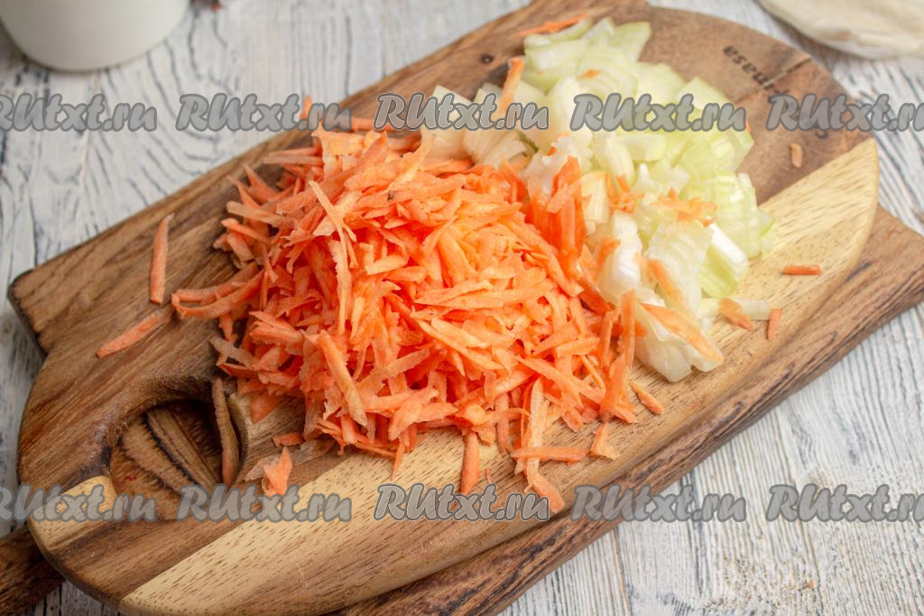 Очистите морковку и лук. Лук нарежьте достаточно мелко, натрите на крупной тёрке морковку.