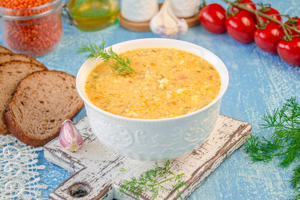 Вкусный, насыщенный суп, сваренный с чечевицей и плавленным сыром, подавайте к столу тёплым.