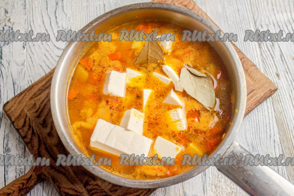 Для приготовления супа я взяла плавленный сырок типа "Дружба", предварительно нарезав его на кусочки. Можно взять и пастообразный плавленный сыр.
