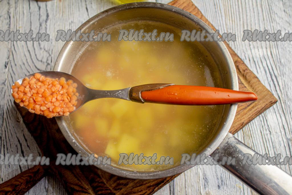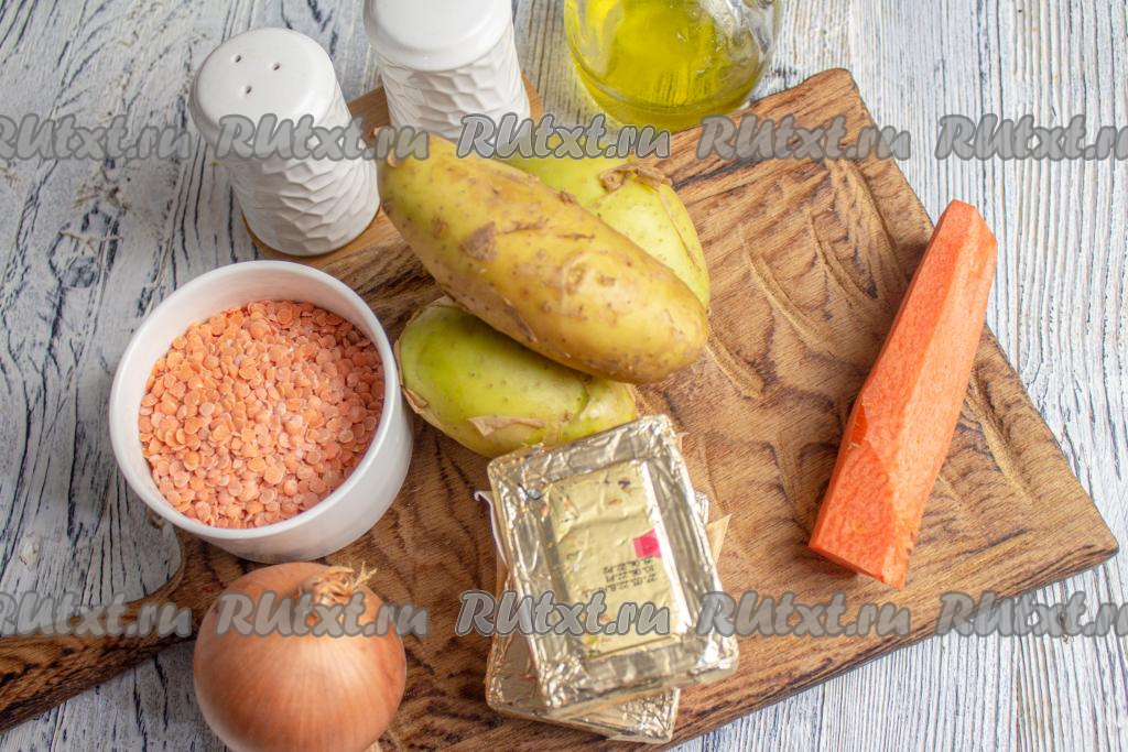 Подготовьте необходимые ингредиенты. Я варила суп с красной чечевицей, если вы готовите блюдо с другими сортами чечевицы, тогда предварительно замочите чечевицу в воде комнатной температуры минимум на 30 минут (можно оставить в воде и на 1-2 часа), затем лишнюю воду слейте.
