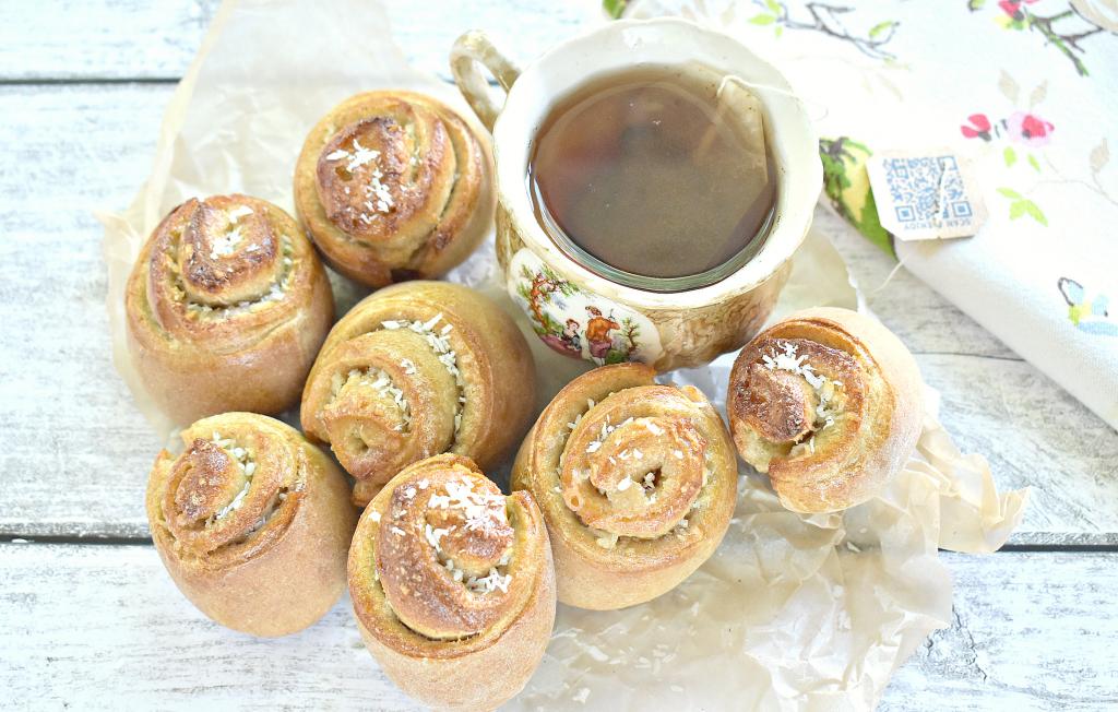 Предлагаю испечь аппетитные булочки, замешанные на сухих дрожжах с добавлением полезной цельнозерновой муки. Выпечка получается пышной, мягкой и очень вкусной. В качестве начинки для булочек я использовала сахар и кокосовую стружку, которую можно заменить, например, на мак или молотую корицу. Испеките такие булочки и они украсят ваше чаепитие!
