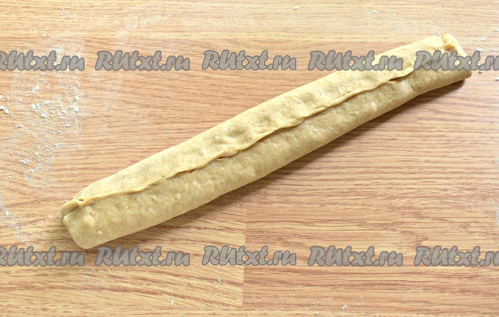 Начиная с широкой стороны, сворачиваем каждый пласт в рулет, скрепляем шов (из трёх раскатанных пластов теста получается 3 рулета).
