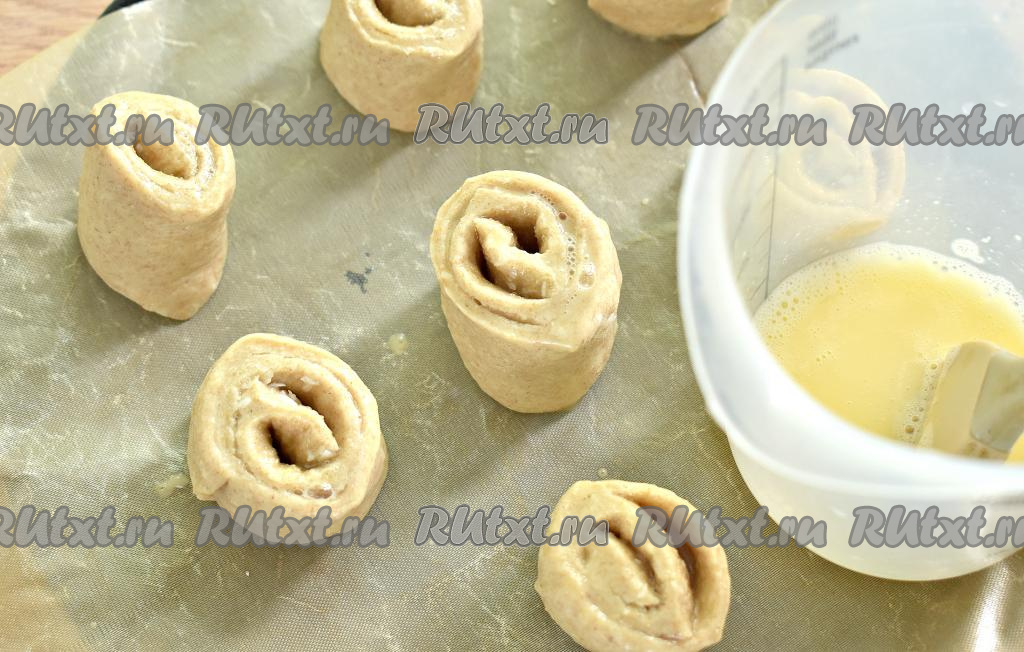 Заготовки булочек ставим срезом вверх на противень, застеленный пергаментом. Поверхность булочек смазываем взбитым яйцом. Всего у меня получилась 21 булочка.