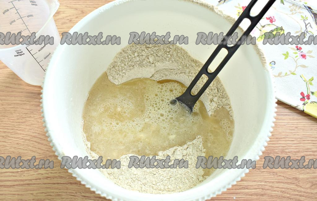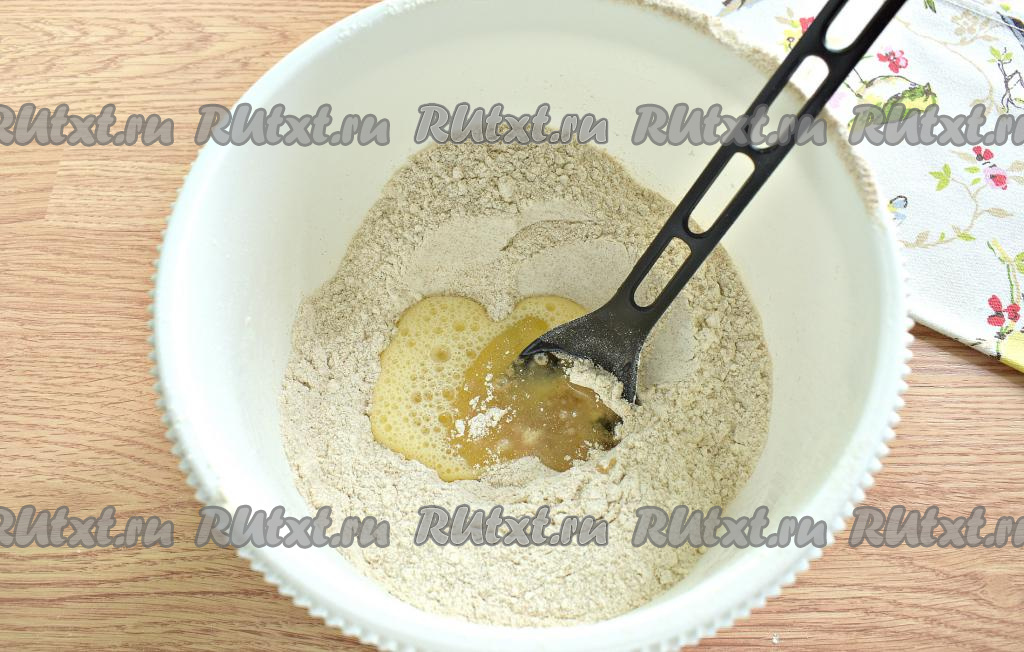 Перемешиваем ингредиенты сначала в миске ложкой, собирая тесто в комок. Затем замес теста продолжаем уже на столе руками. Тесто должно стать мягким и не прилипать к ладоням.
