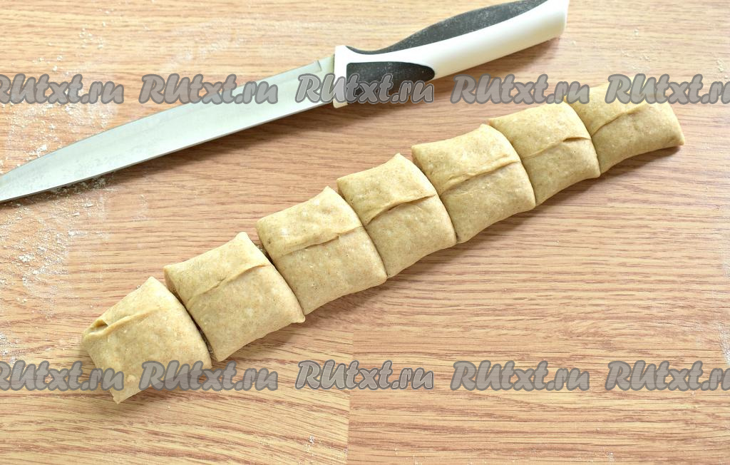 Дрожжевое тесто обминаем, делим на 3 равных куска. Каждую часть теста на присыпанной мукой поверхности раскатываем в пласт в форме четырёхугольника (приблизительный размер 28 сантиметров на 19 сантиметров). Поверхность каждого пласта смазываем 1 чайной ложкой растительного масла, посыпаем 1 столовой ложкой сахара и кокосовой стружкой. Стружку можно заменить молотой корицей или маком.