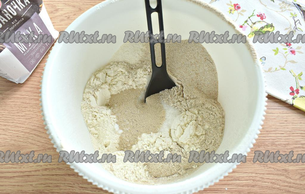 В глубокую миску просеиваем пшеничную и цельнозерновую муку. Всыпаем 2 столовые ложки сахара, соль и сухие быстродействующие дрожжи, перемешиваем, образуя в центре воронку.