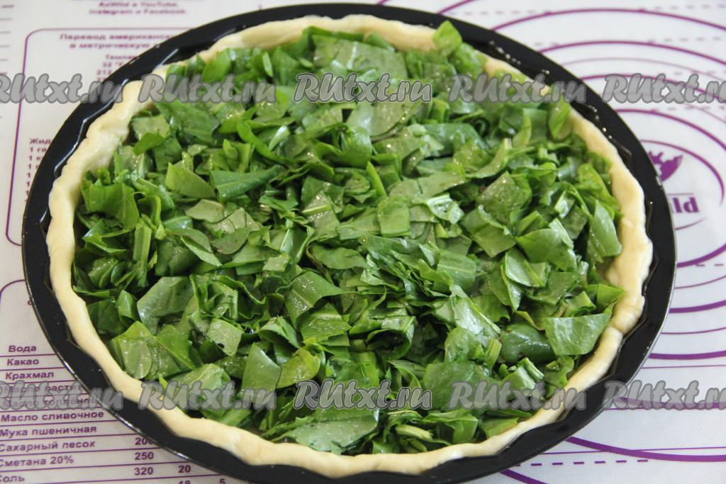 Выложить начинку из щавеля. Пирог с щавелем из дрожжевого теста выпекать в разогретой духовке минут 25 при температуре 180 градусов.
