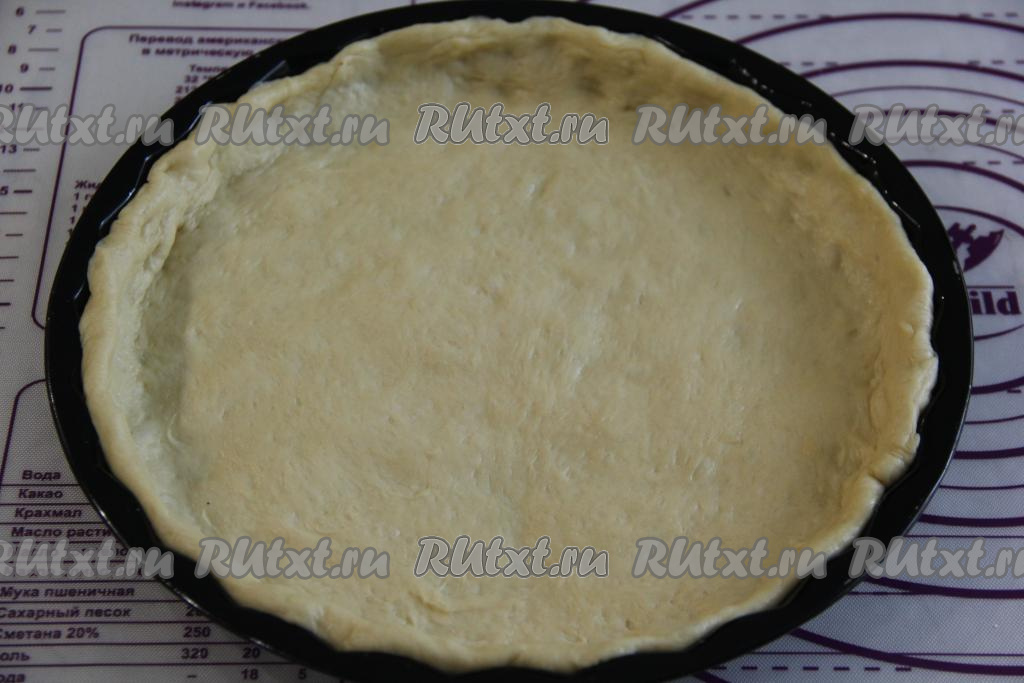 Форму для выпечки (у меня форма диаметром 25 сантиметров) смазать растительным маслом. Тесто обмять и выложить в форму. Распределить тесто по всему дну формы, также сформировать бортик по краю.